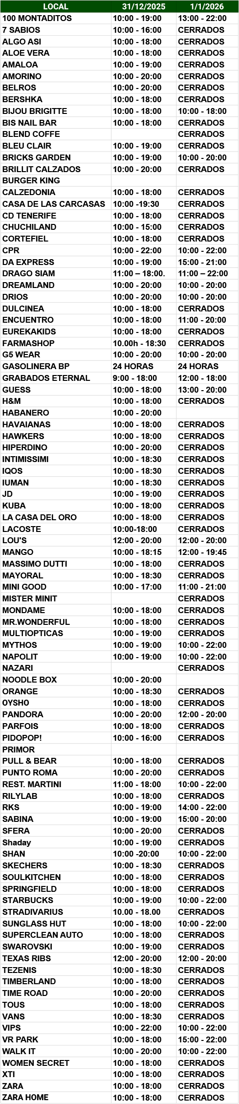 Si el horario de tu tienda favorita no aparece en esta lista, significa que aún no contamos con la información confirmada. Te recomendamos consultar nuestro directorioy contactar directamente con el establecimiento para conocer su horario actualizado.