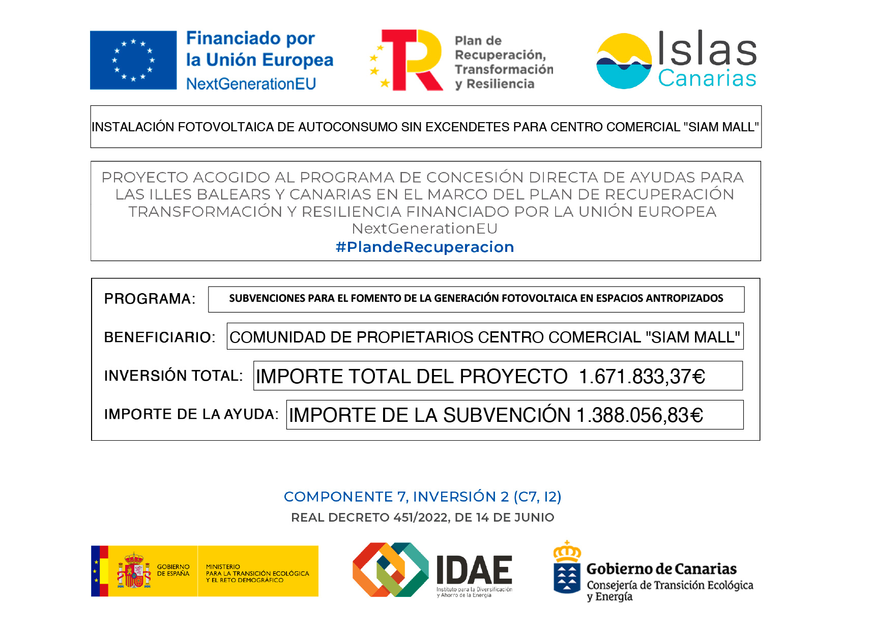 Las actuaciones llevadas a cabo por la Comunidad de Propietarios Centro Comercial «Siam Mall» han consistido en la implantación de una instalación fotovoltaica de autoconsumo sin excedentes destinada a dicho centro comercial.